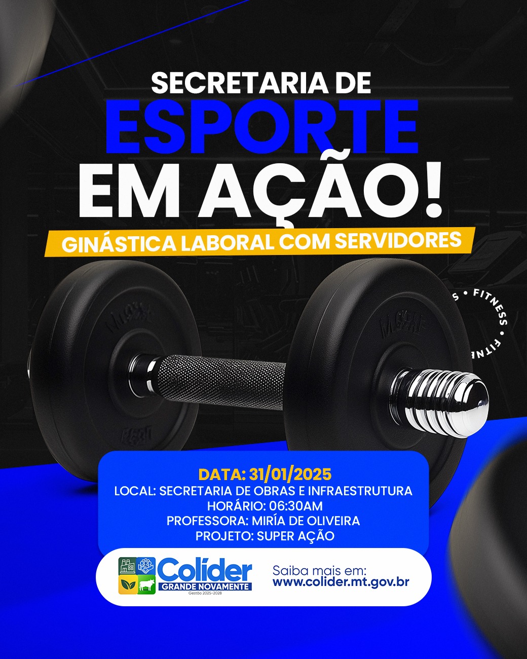 A prefeitura municipal de Colíder por meio da Secretária Municipal de Esportes realiza o projeto SUPERAÇÃO. O projeto de ginástica laboral para os servidores da Prefeitura Municipal tem como missão a promoção e prevenção da saúde dos colaboradores. Os objetivos são reduzir o esforço na execução das tarefas diárias, melhorar a postura, combater o estresse, entre inúmeros outros.