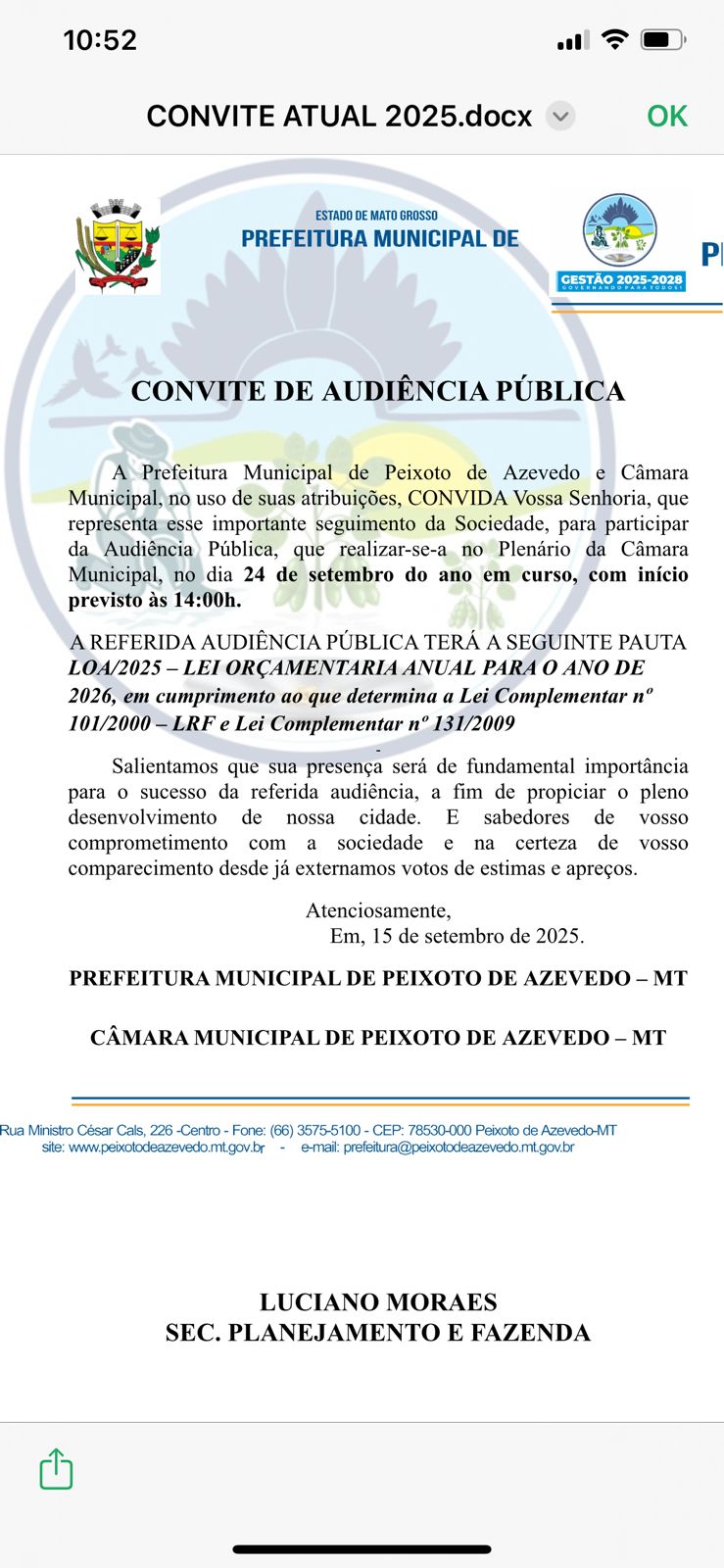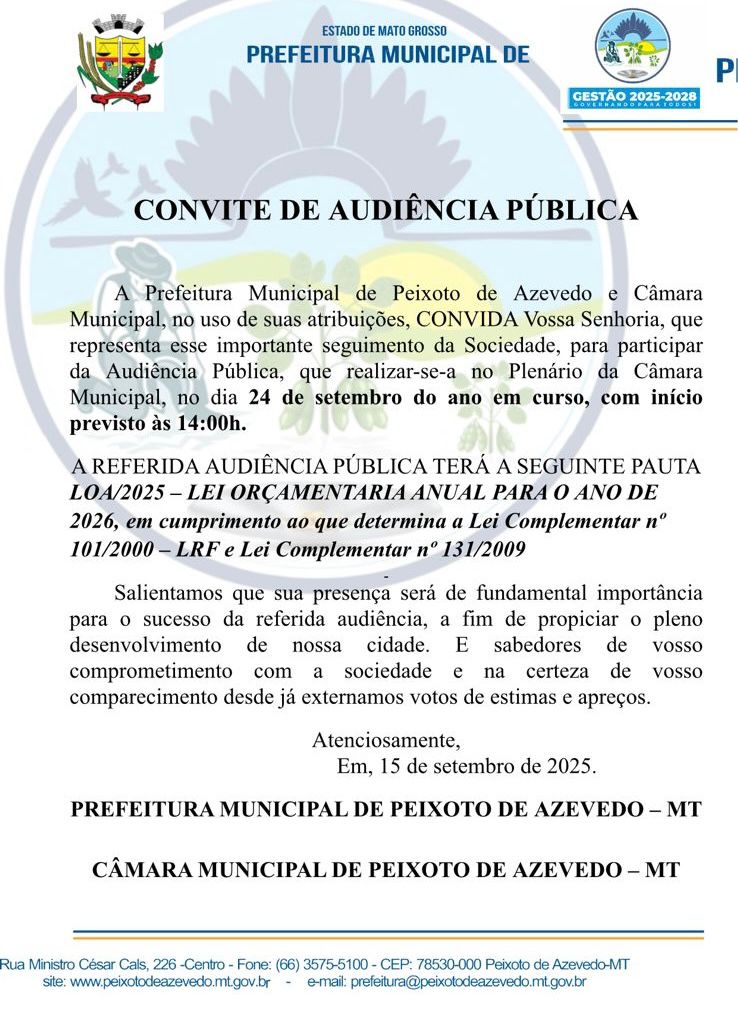 A Prefeitura Municipal de Peixoto de Azevedo e Câmara Municipal, no uso de suas atribuições, CONVIDA Vossa Senhoria, que representa esse importante seguimento da Sociedade, para participar da Audiência Pública, que realizar-se-a no Plenário da Câmara Municipal, no dia 24 de setembro do ano em curso, com início previsto às 15:00h.