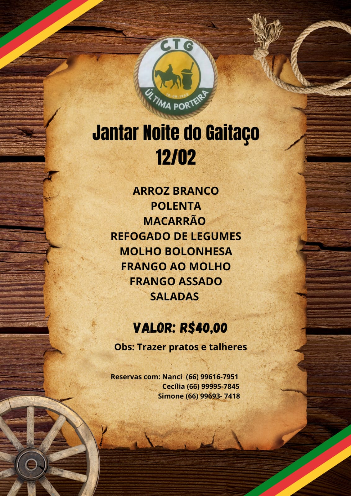 A programação contará com um tradicional jantar, seguido de uma noite de integração cultural, marcada pelo som da gaita, pelo encontro das famílias e pelo fortalecimento das nossas raízes tradicionalistas.